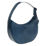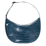 Sac à bandoulière en forme de lune fabriqué à partir de matériaux partiellement recyclés. Le sac contient un compartiment avec trois poches intérieures et une fermeture à glissière sur le dessus.