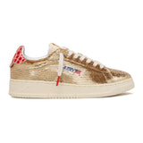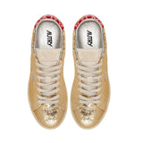 Turn heads with the Autry Dallas Glitter Platinum/Red, a statement sneaker entirely covered in sparkling gold glitter, finished with a bold red heel tab for a striking contrast. Blending retro tennis inspiration with glamorous style, this low-top design features premium leather details, cushioned lining, and a durable rubber sole for everyday comfort. The perfect mix of shine, sport, and sophistication.